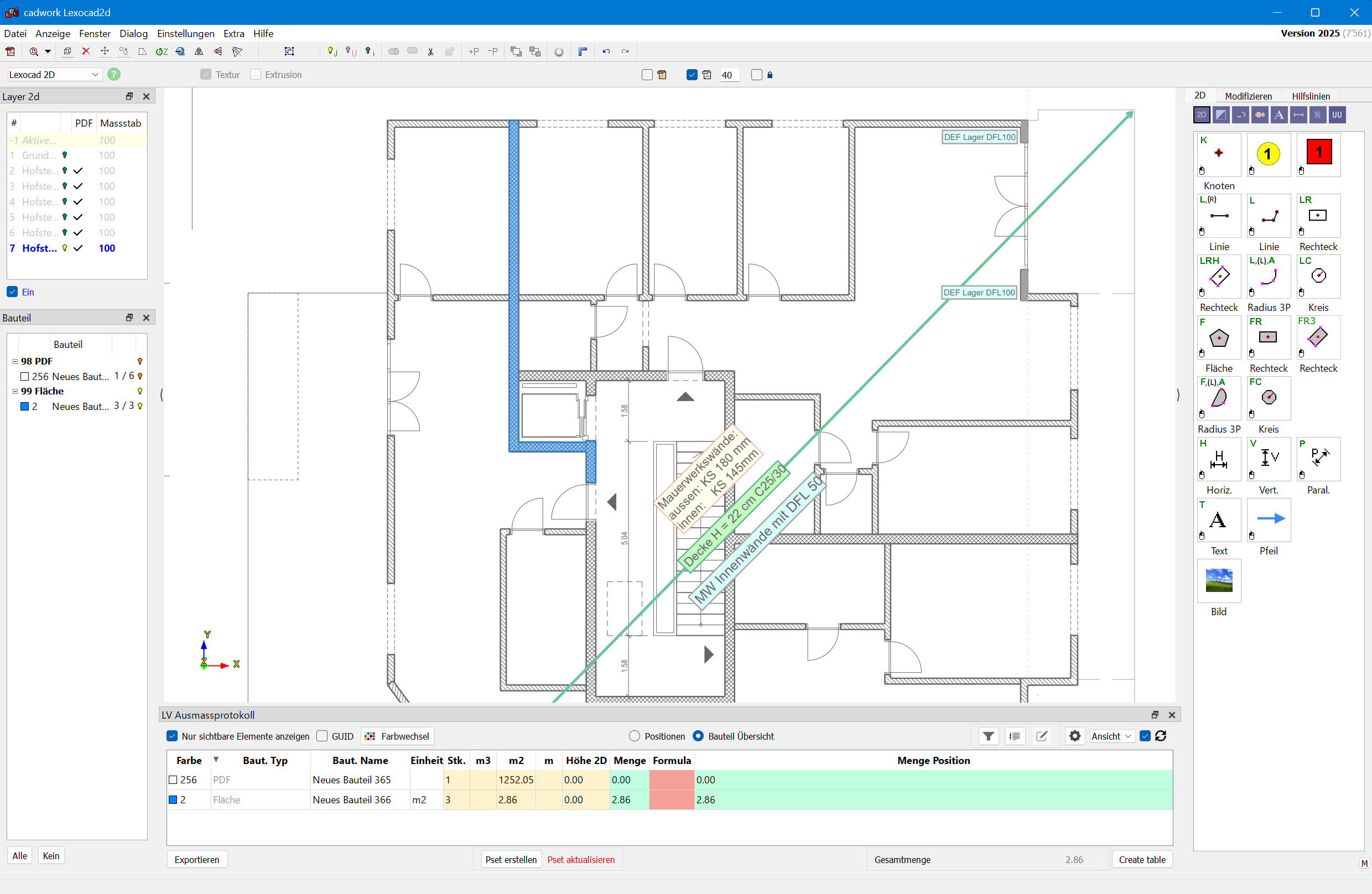 Mit dem individualisierbaren Lexocad Bauteilkatalog (LBK) können Mengen automatisiert ermittelt werden, um z.B. ein Leistungsverzeichnis nach NPK zu erstellen. Den Lexocad Bauteilkatalog können Sie so aufsetzen, dass die Mengen nach Ihrem Bedürfnis automatisiert ermittelt werden.