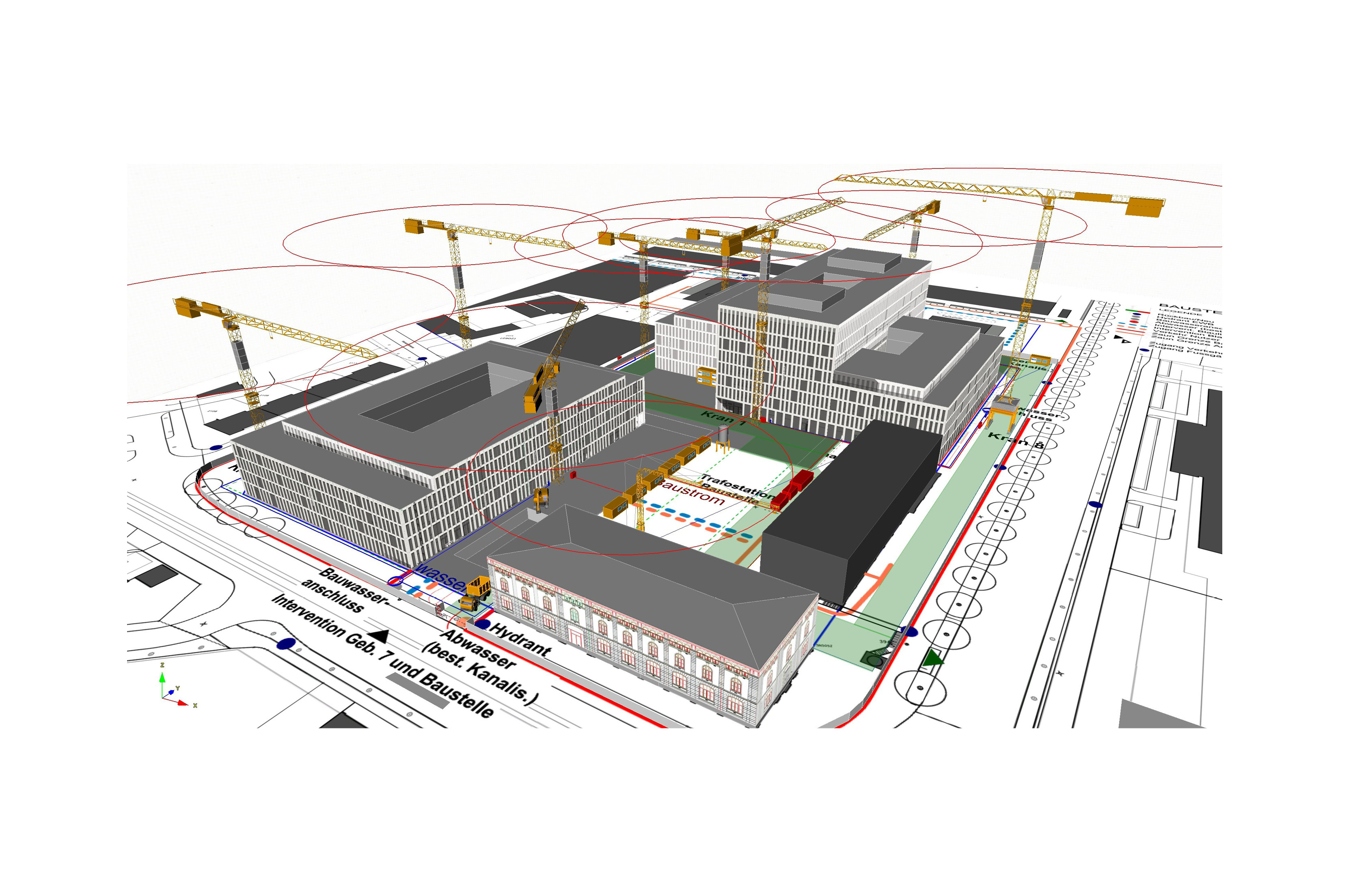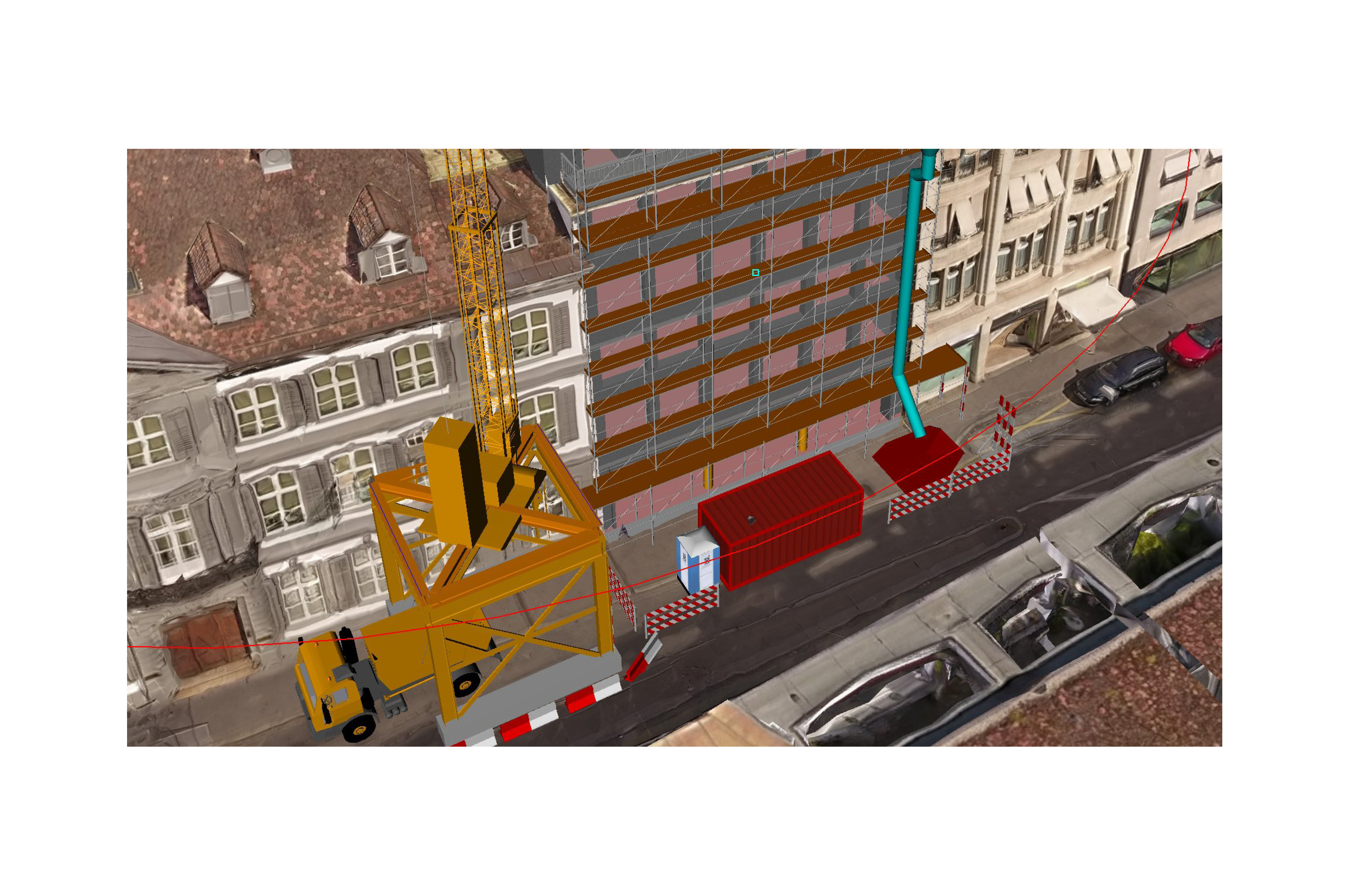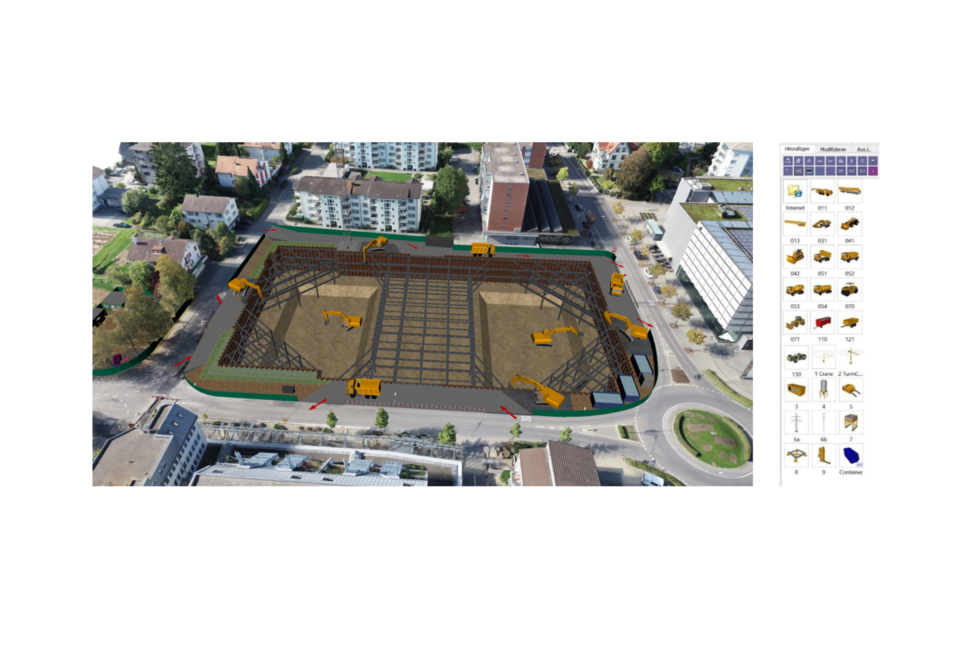 Mit Hilfe der zur Verfügung stehenden Katalogbauteile sowie den parametrisierten Bauteilen können Sie in kurzer Zeit ihre Baustelleninstallationsplanung vornehmen. Per Drag & Drop können Sie Kran, Fahrzeuge, Zaun, Container, etc. aus der Bibliothek in die Arbeitsfläche ziehen und Ihre Bauplatzinstallation vervollständigen. Umschlagsflächen können modelliert und mit einem Text versehen werden. Des Weiteren können 3D Texte sowie Bilder hinzugefügt werden.