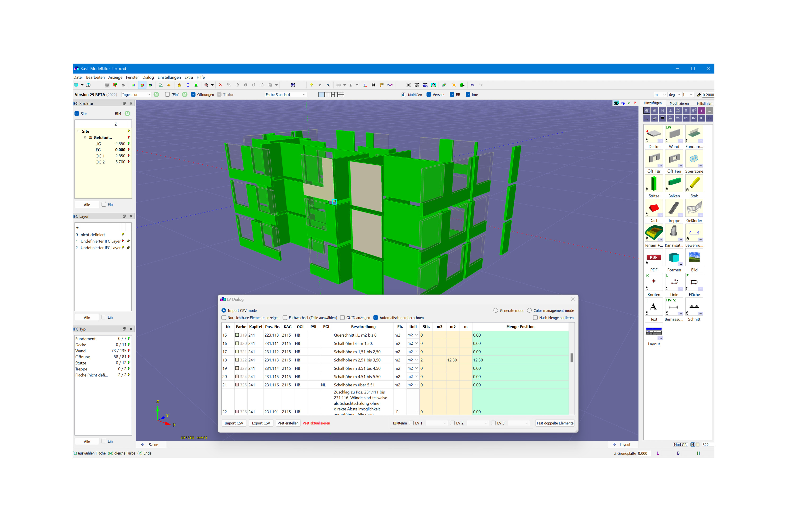 Es ist auch möglich die Positionen eines Leistungsverzeichnisses zu importieren und so die ermittelten Mengen direkt den Positionen des Leistungsverzeichnisses zuzuordnen.